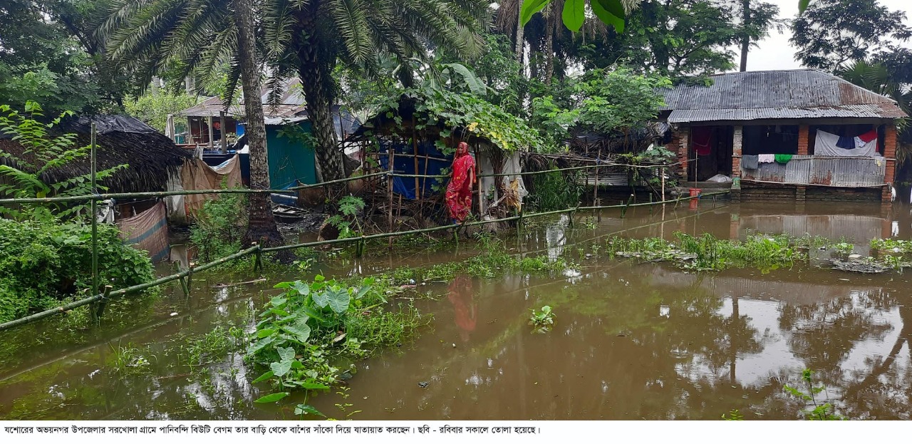 Persistent rainfall has once again led to severe waterlogging in the Bhobodaha region of Abhaynagar upazila in Jashore. Vast areas including 4 unions and a municipality are submerged. Hundreds of families are stranded in their homes, with crop fields inundated and fish enclosures swept away.