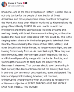 US President Donald Trump officially confirmed early Sunday on social media that Iran’s Supreme Leader Ayatollah Ali Khamenei has been killed. This came shortly after he had stated that he needed “definitive and visible evidence” of the supreme leader’s death.
