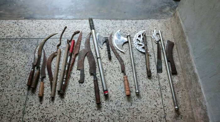 The recovered weapons included four Chinese axes, a machete, knives of various sizes, an iron baton, a steel rod, and a spear.
